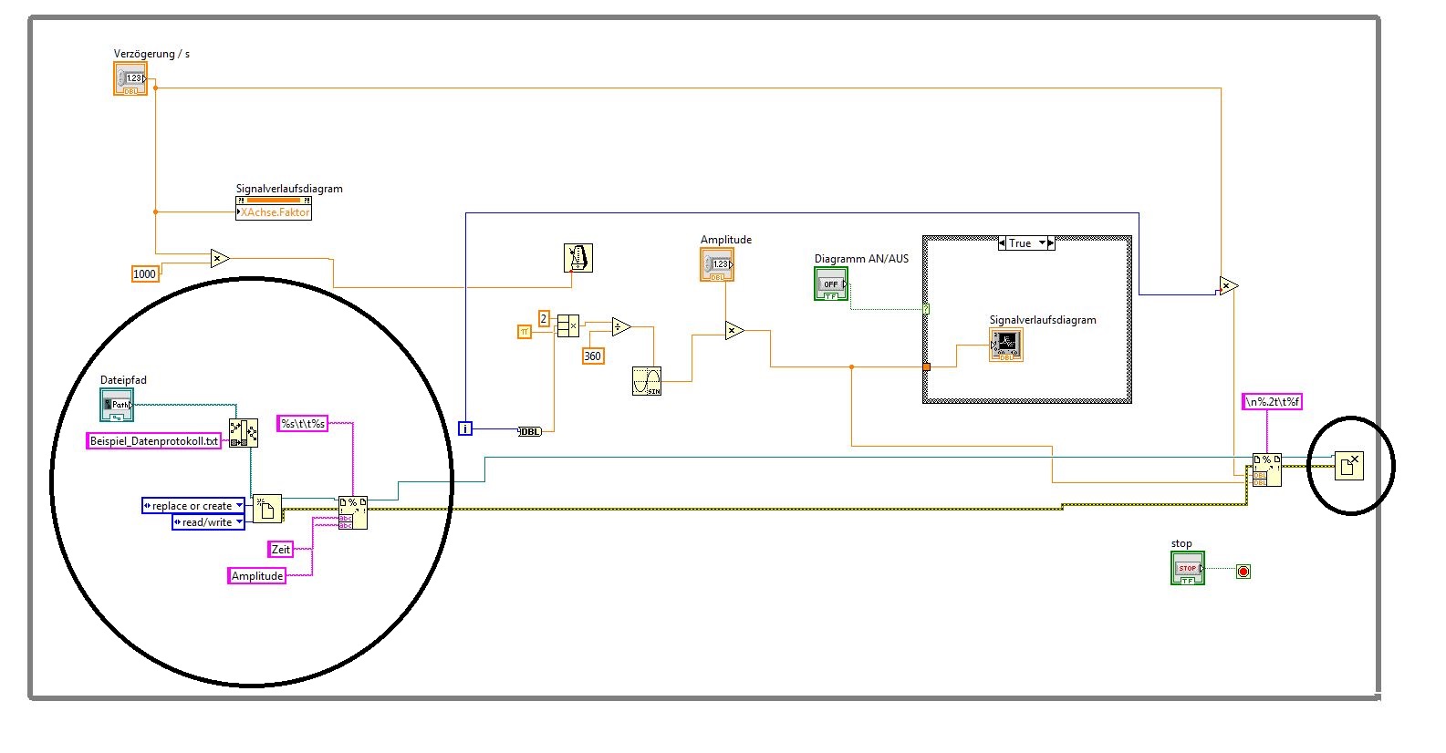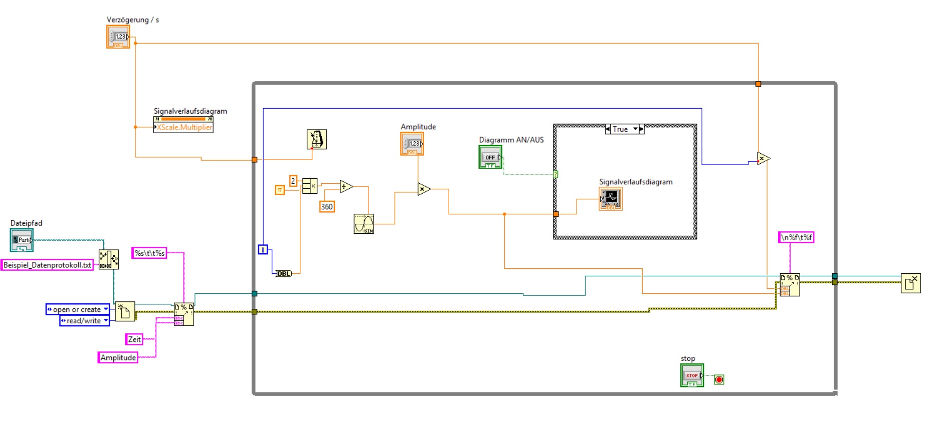 Es könnte von Vorteil sein, den Fehlercluster hier auch mit einem ODER an den Schalter zum Beenden der Schleife anzufügen. Tritt ein Fehler auf, wird die Schleife beendet. So läuft ggf. die Schleife als weiter, den Fehler kriegst Du aber erst am Ende dann mit, nachdem Du den Beenden-Button gedrückt hast.