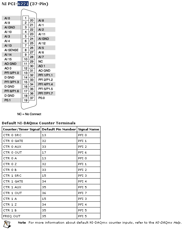 ' schrieb:Kann mir hier nicht weitergeholfen werden? Ich hab bereits alles versucht, aber ich bekomme kein Signal an den Ausgang. Einzig und allein einen Digitalen Ausgang konnte ich auf high schaufeln. Aber weder Sinus noch Counter lassen sich ansprechen. Kennt sich jemand mit der Pinbelegung der NI-6221 (37-Pin) aus? Unter Counter steht da PFI 0, PFI 1, PFI 2, PFI 6, PFI 0, PFI 1, PFI 2. Habe aber an keinen dieser Pins etwas messen können, obwohl ich die Dauer der High Position auf 2Sekunden gestellt habe. Wollte eigentlich mittels eines Counters eine Sinuspannung und einen Inpuls an den Ausgang schalten.