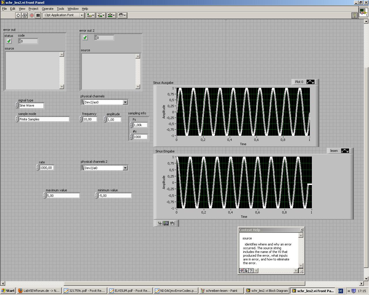 Ich möchte mit Hilfe eines Elvis 2 Boards ein Sinussignal einlesen, dass ich vorher selbst am PC generiert habe. Also im Idealfall sollte der Verlauf exakt gleich sein.