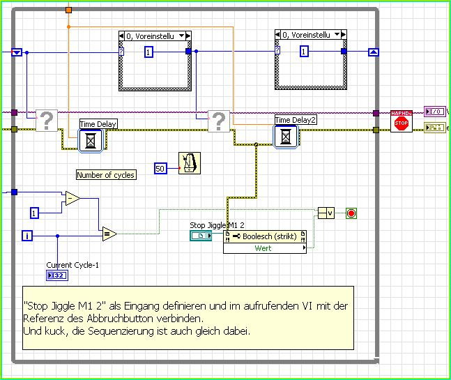 Naiv dachte ich, ich kann einen Stop-Button (Stop inner, z.B.) einfach in die SubVi uebertragen. Man verdrahtet einen Stop-Button mit dem Eingang der SubVi und dann wird das Signal in der SubVi an die richtige Stelle geleitet.