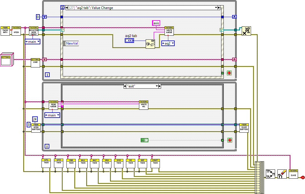 Im Beispiel siehst du zwei große While-Schleifen (obere für Eventhandling untere zum Anzeigen von Daten aufm FP) und mehrere parallele SubVIs unten. In jedem SubVI ist eine While-Schleife drin. Die Kommunikation erfolgt bei mir über meine Tasking Libraray. Wenn man aufn Button aufm FP klickt, wird ein bestimmtes SubVI mit einem Befehl+Parameter angesprochen.
