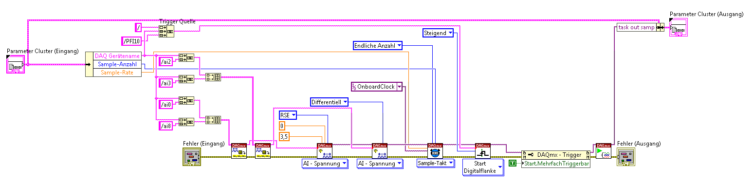 So wie es jetzt aussieht funktioniert es auf jeden Fall nicht (Fehler -50103 bei DAQmx Start Task...Die ausgewählte Resource ist reserviert...). Der zweite Task wird erst gar nicht gestartet. Warum ist mir noch nicht klar. Kann ich die OnboardClock nicht in beiden Tasks verwenden?!