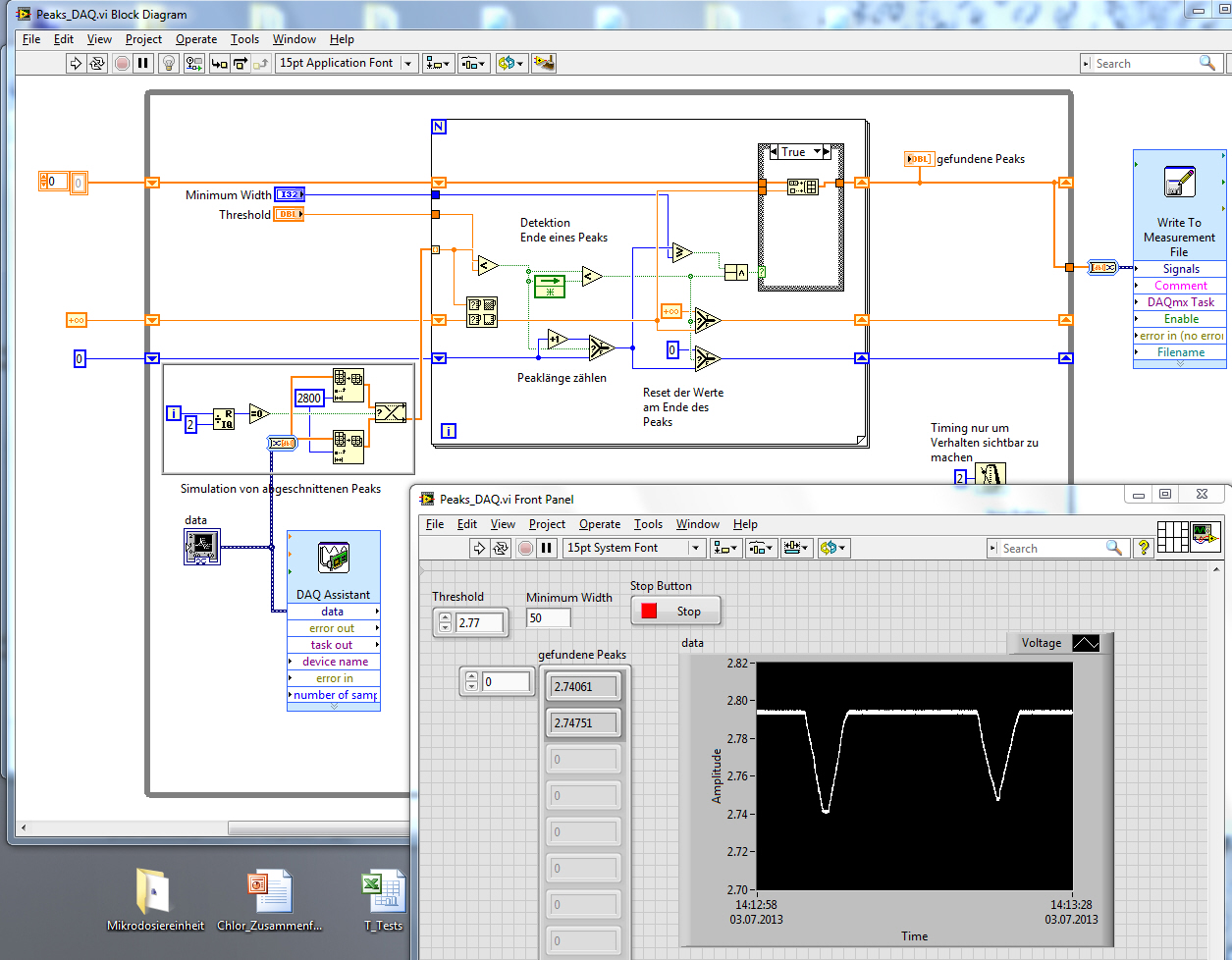 Problem warum es bei dir nicht ging ist die Art der Verwendung. Dein DAQ-Assistent liefert dir Daten zyklisch und u.U. hört er auch innerhalb eines Peaks auf. Dies bricht die Peakerkennung ab und weiterhin zeigen die Anzeigeelemente immer nur die Ergebnisse der letzten Schleifeniteration an.