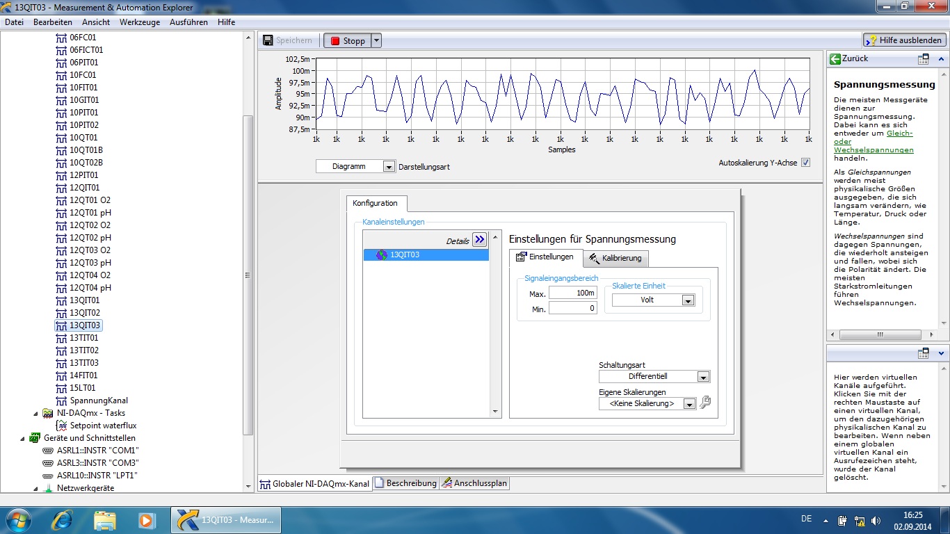 Mein Problem: Ich habe 3 Sauerstoffssonden die mir meine Sauerstoffkonzentration messen und an meine LabView Oberfläche bzw an mein cDAQ übermitteln sollen. Wenn ich mir das Signal meiner Sensoren im Measurment Explorer anzeigen lasse verhält es sich nach Neustart der Messung so, dass das Signal erst in der richtigen Größenordnung ist (nur geringer Schwankung sind vorhanden). Nach ungefair einer Minute fängt das Signal an stärker zu oszillieren und zeigt sehr große Variation in der Spannung. Ab diesem Zeitpunkt liegt nur noch das Maximum der Amplitude im richtigen Größenbereich also das gemittelt Signal ist zu gring.
