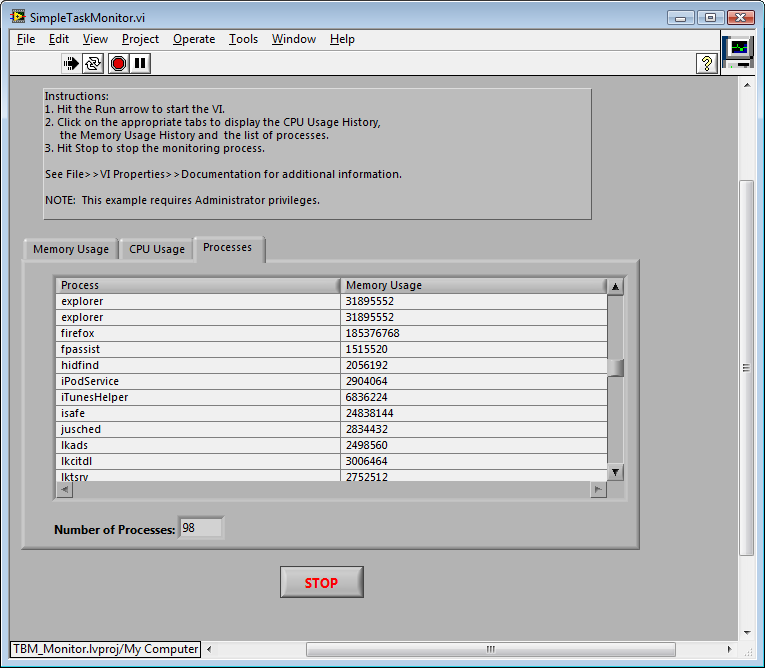 Ist eigentlich nix anderes als der Task-Manager. Hier steht auch die aktuelle Speicherbelegung für die Anwendung. Dann mußt Du halt noch den string nach LabVIEW durchsuchen...