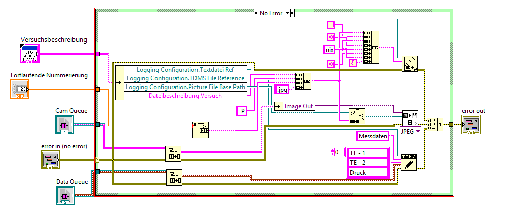 Zunächst ein Ausschnitt aus dem Hauptprogramms mit den drei Loops von oben nach unten: Kamera, Acquire (grüner Loop), Logging (oragner Loop)