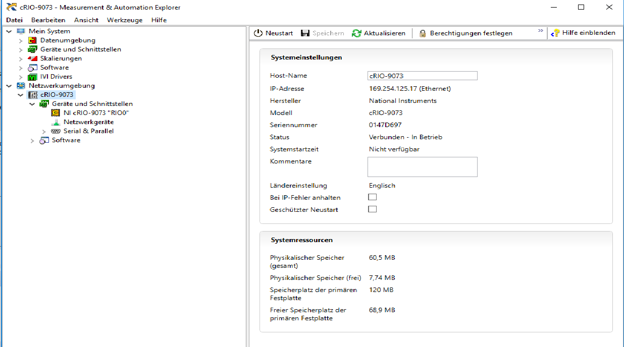 Ich habe ein cRio9073 mit Perepherie per rs232 und analog angeschlossen und habe das Problem, dass ich zwar die Analogen daten abgreifen kann, aber beim Laden des Real-Time.VI einen Fehler bekomme, der sagt, dass der Speicher voll ist. Ich habe aber keine Ahnung woran das liegt.