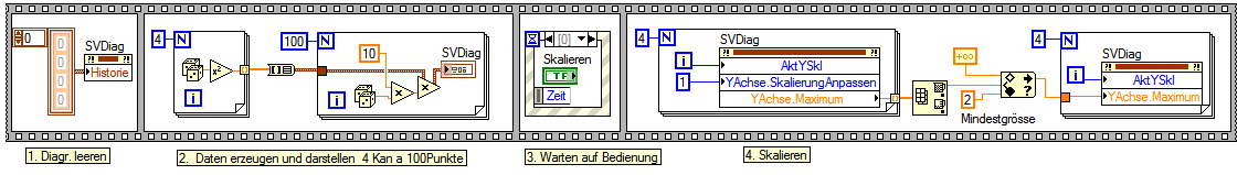 Es ist immer ungünstig, wenn wegen jedes neu hinzugekommene Datenpunkes neu skaliert wird. Deshalb ist Autoskaling bei SV-Diags standardmäßig abgeschalten. Darüber hinaus war aber auch mein Beispiel in dieser Hinsicht Shit. Im ungünstigsten Fall wird wegen jedes neuen Punkts das Diag 3 mal skaliert: 1. weil Autoscaling aktiviert ist --> abschalten! 2. Weil einmalig über Eigenschaftknoten autoscaliert wird. 3. Weill alle Diagramme wie gewünscht skaliert werden.