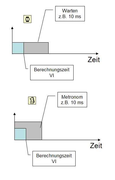 Im Prinzip arbeitet die Metronom-Funktion genauso, aber sie wartet nicht die eingestellte Zeit, sondern solange, bis der interne ms-Timer des Computers ein ganzzahliges Vielfaches des eingestellten Wertes erreicht hat. Erst dann geht es weiter. Somit kann ein erster Aufruf in einer Schleife eine deutlich kürzere Wartezeit bedeuten.