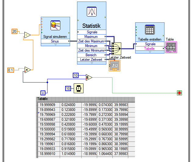 Ergänzung: Zur Funktionsweise des Express-VI "Signal simulieren". Es ist auf kontinuerliche Erzeugung eingestellt. D.h die Sinuskurve wird inklusive Zeitstempeln bei jedem neuen Aufruf genau an der Stelle fortgesetzt, bei der sie beim letzten Aufruf beendet wurde. Dabei macht es keinen Unterschied, ob zwischen den beiden Aufrufe 1ns oder 1 Stunde gewartet wurde. Der Wert das äußeren Timers geht überhauot nicht in die simulierte Ausgabe ein, und natürlich geht auch nicht ein, ob der wie eine Taschenuhr oder wie ein Metronom aussieht. Das Simulations-VI verwendet ausschließlich simulierte Zeiten, und keine Zeiten aus der realen Welt der Schleife, in der er sich befindet.