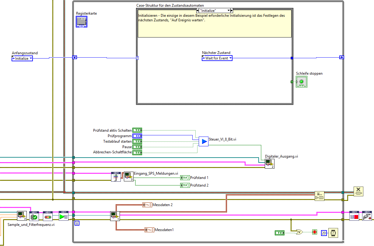 das war auch mein erster Gedanke, habe es dann aber gelassen weil ich mir gedacht habe, dass die Schleife stehen bleibt und die Datenerfassung stoppt während die Statemachine auf etwas wartet. Habe jetzt mal ein Beispiel eingepflegt und tja... es ist das passiert was ich erwartet habe, alles steht still, während auf ein Ereignis gewartet wird.