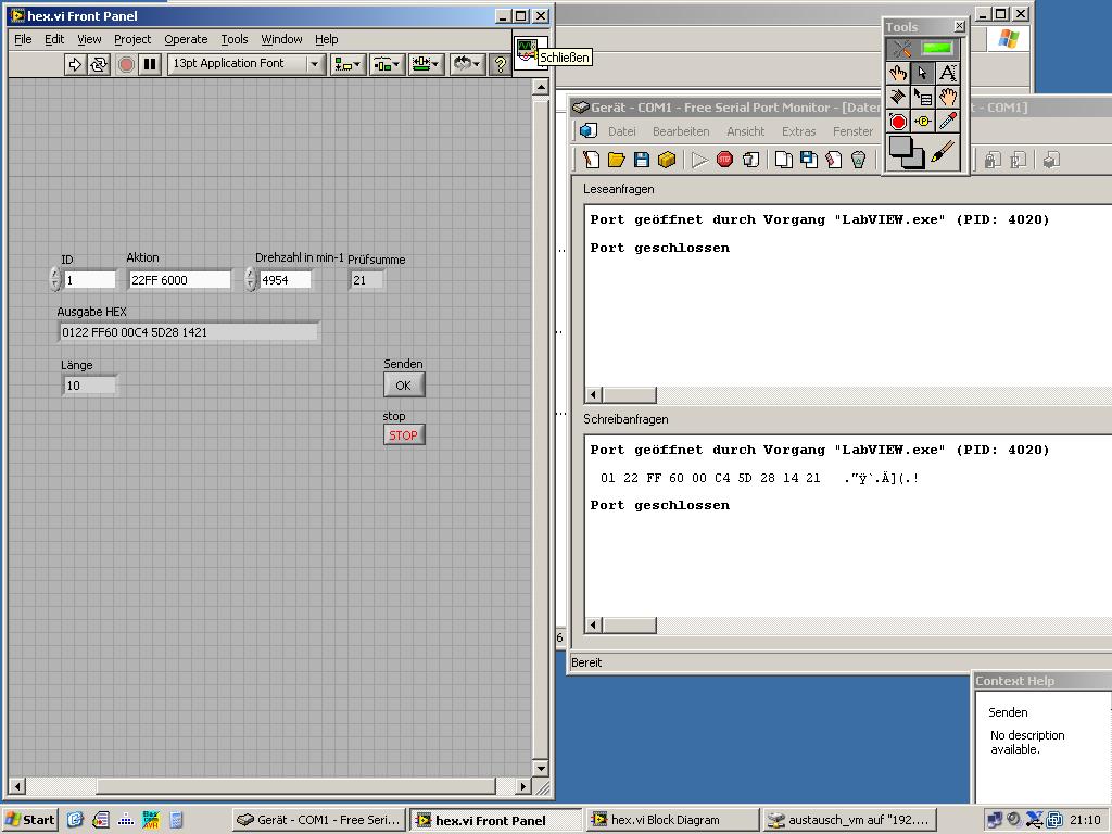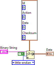 Also ich verstehe wirklich die Schwierigkeit die Daten aus binären String in Zahlen umzuwandeln. Ich habe doch oben schon geschrieben. Mach dir einen Cluster aus Elementen, aus denen dein Paket besteht. Diesen Cluster kannst du an Unflatten From String (oben als Typ) anschliessen. Links wird dein binäres String angeschlossen und rechts kommen schon die richtigen Paketdaten als Zahlen raus. Vergiss aber nicht little-endian Format anzugeben, denn deine Pakete kommen Byte-verdreht.