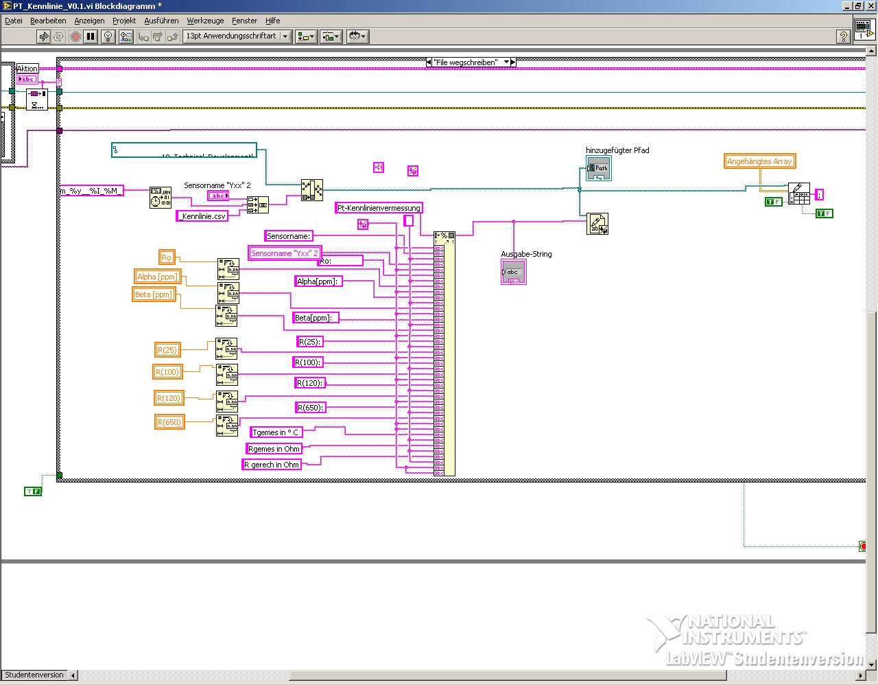 Du schreibst mit "Write to Textfile" und ""Write to Spreadsheetfile" in eine Datei (Kennlinie.csv). Das dürfte der Fehler sein. Benutze mal für Ausgabe-String und Angehängtes Array unterschiedliche Dateinamen. Oder sollen alle Daten in einer datei stehen? Dann musst du die Daten zusammenfassen und in eine Datei schreiben.