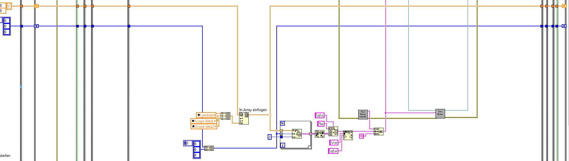 -> Wenn Messung beenden auf True -> Werte werden Array hinzugefügt (beim ersten mal ausführen leeres Array), in String umgewandelt und von oben nach unten in die Textdatei reingeschrieben.