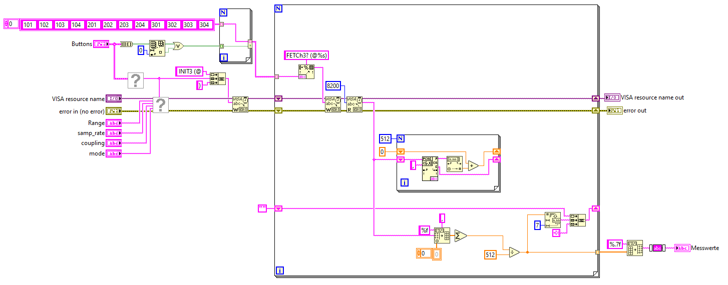 Die untere rechte kleine Whileloop dient nur zur regelmäßigen Abfrage und Anzeige der aktuellen Temperatur im Klimaschrank. Das soll auch dann passieren, während die Messung weiter läuft.