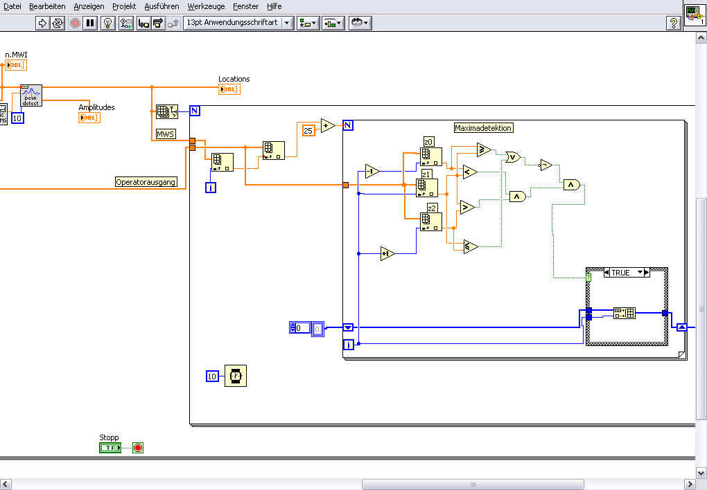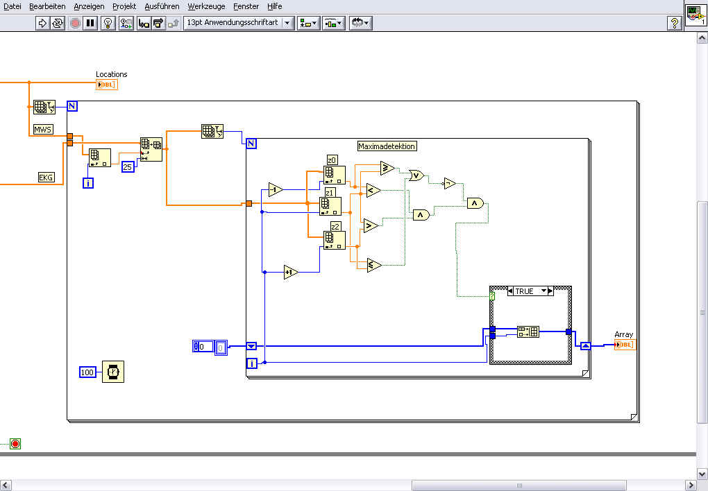 ' schrieb:Ich würd das VI "Teilarray" (engl: "Array Subset") nutzen. Das Eingangsarray wäre in diesem Fall das zweite Signal, der Index die Position des Maximums im ersten Signal und die Länge die gewünschten 25 Samples.