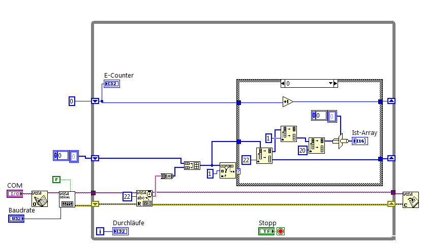 Die Programmierung an und für sich macht jmd anders der auch keine wirkliche Ahnung von LabVIEW/serieller Kommunikation hat - ist aber auch noch nicht festgelegt. Die Befürchtung schlecht gewähler Bytes hatten wir auch schon immer im Hinterkopf irgendwo^^ Es ging hier hauptsächlich darum erstmal zu schauen was überhaupt möglich ist - hier sind also Änderungen, die das Verhalten verbessern jederzeit möglich und auch Vorschläge dafür gern gehört.