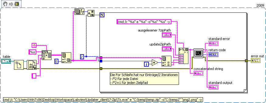 Da Du den Pfad zu 7-z als vollen Pfad anzugeben scheinst, sollte cmd eigentlich nicht nötig sein. LabVIEW lässt Windows einfach einen Prozess erzeugen mit dem ganzen String. Windows interpretiert den ersten Parameter als Prozess der gestartet werden soll und übergibt diesem den Rest des Strings als Parameter. Aber ich sehe dass Du den Pfad zu 7-z in Anführungszeichen hast, und es könnte sein dass die Prozesserzeugung in Windows keine Quoted Strings parsen kann. Deshalb funkt es mit cmd voran, das kann durch CreateProcess() richtig interpretiert werden und cmd macht dann den Rest.