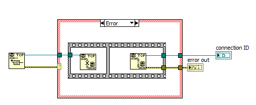 Du widersprichst dir gerade selber. Zwecks Datenfluss gibst du den Fehler nach TCP-Read raus (in der Annahme, dass Error-Out der Cluster ist, den du aus deinem SubVI weitergibst). Das zeigt ja auch der Text, Error in TCP-Read. Parallel zum Error-Out behandelst du den Fehler in einer Case-Struktur. Laut deiner Aussage funktioniert das ja wunderbar. Also: Datenfluss korrigieren, und alles wird gut: