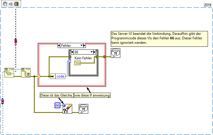 Ich starte asynchron ein VI und gebe diesem IP, Port und ein Queue mit. In dem VI wird die Verbindung aufgebaut, und die Referenz über das Queue weitergeben. Wenn ich anschließend an einer anderen Stelle die Verbindungsreferenz aus dem Queue entnehme und etwas über die Verbindung senden will erhalte ich den LabVIEW Fehler: (Hex 0x1) Ungültiger Eingangsparameter…