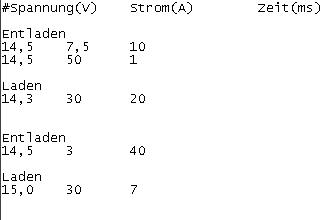 Die Tabelle beinhaltet Spannung, Strom und Zeit, Sowie Laden und Entladen...