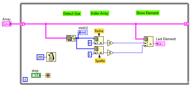 Du arbeitest ja mit einem Array. Wenn du nun mit Array Size und Index Array arbeitest, bekommst du immer das letzte Element aus diesem Array. Bei einem 2D Array musst du dann nur noch das Element suchen, welches du anzeigen möchtest.