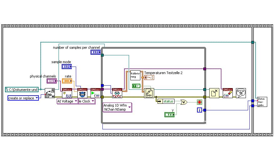 folgendes Problem. Ich lese mit angehängten Vi alle analogen Inputs ein. Zusätzlich habe ich aber noch 2 digitale Inputs. Meines Wissens nach kann ich dieses aber nicht im "DAQmx Create Channel" kombinieren, da ich dort nur einen Wert eingeben kann. Mein Ziel ist es aber alle Daten genau zum selben Zeitpunkt einzulesen. Daher ist meine Frage, ob es irgendwie möglich ist die Task out zu kombinieren, so dass beide in mein "DAQmx Timing" gehen. Wenn ich zwei "DAQmx Timing" verwenden würde bestünde doch die Möglichkeit, dass das eine früher startet als das andere, oder nicht? Vielen Dank für Eure Hilfe!