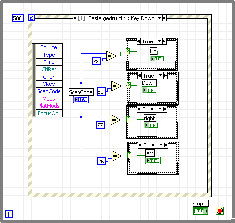 Hab nebenbei auch ein kleines Programm zur Erkennung der jeweiligen Tastaturtaste geschrieben. Die Erkennung klappt auch, jedoch kann ich die Anzeige, welche Tastaturtaste gedrückt wurde nicht weiterverarbeiten, also nicht im meinen Event-Case einbauen. Scheinbar handelt es sich nicht um ein Ereignis. Jedlich Versuch eine Wertänderung der Anzeige als Event zu deklarieren sind fehlgeschlagen. Finde hierbei die LabVIEW-Hilfe ein wenig dünn.