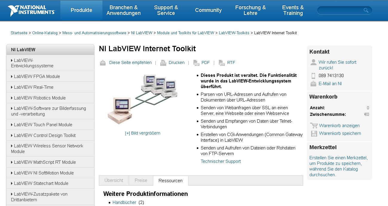 Nicht so schnell aufgeben. Ich habe gecheckt. Internet Toolkit 6.1 ist tatsächlich discontinued und nicht mehr erhältlich von NI. Aber es gibt einen gratis Download von Internet Toolkit 2012, da NI die Teile des Internet Toolkits die nicht in Standard LabVIEW integriert wurden in ein gratis und unsupported Toolkit umgesetzt hat.