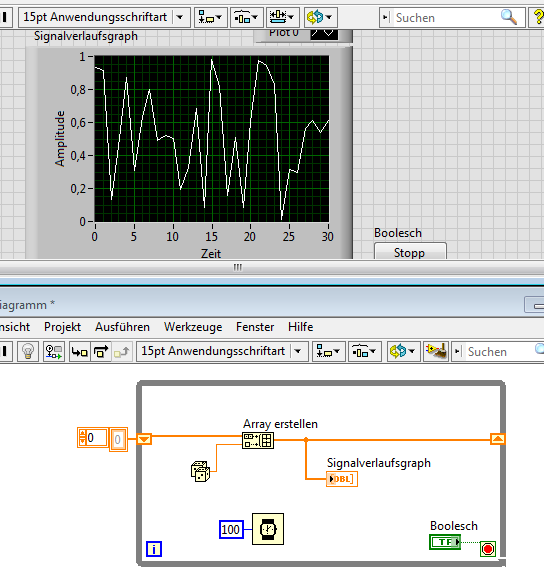 So wie du es verdrahtet hast, bekommst du vom "Temperatur lesen" SubVI ein einzelnen Wert. Da du aber ein Verlauf anzeigen möchtest, solltest du aus den einzelnen Werten ein Array erstellen.