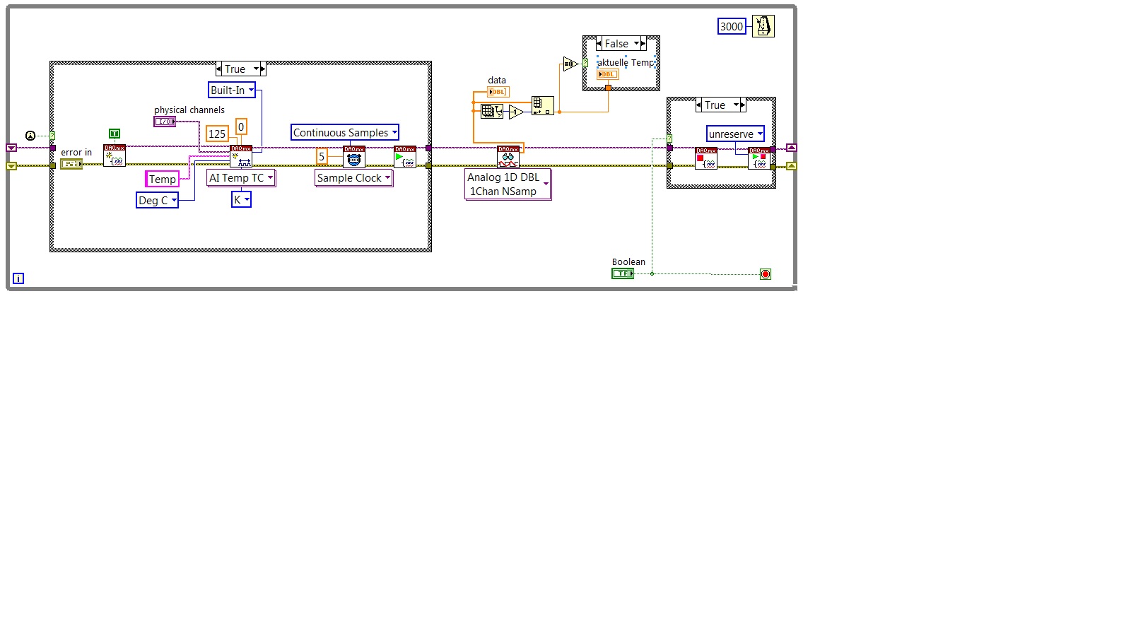 Meine Aufgabe ist es den letzt möglichen Temperaturwert bei Bedarf auszugeben. Später soll das Programm als SubVI laufen und immer bei Aufruf die aktuellste Temperatur ausgeben. Wenn ich dazu die Messung jedes mal neu starte und einen Wert auslese dauert dies meinen Versuchen zufolge länger, als wenn ich die Messung zu einem noch nicht relevanten Zeitpunkt starte und dann nach ausreichend Zeit mit DAQmx read die Werte auslese. Gemäß dieser Idee habe ich mein Programm, siehe Screenshot, aufgebaut. Zu Testzwecken lasse ich die while-Schleife alle 3 Sekunden durchlaufen. Meiner Theorie zufolge müsste DAQmx read den Puffer mit den Werten der letzten 3 Sekunden auslesen, wenn ich davon wieder den letzten Wert nehme sollte ich doch die aktuellste Messung gewonnen haben. Leider funktioniert das nicht, irgendwie hinken die Werte genau um diese 3 Sekunden hinterher. Ich finde leider nicht was ich übersehen habe.