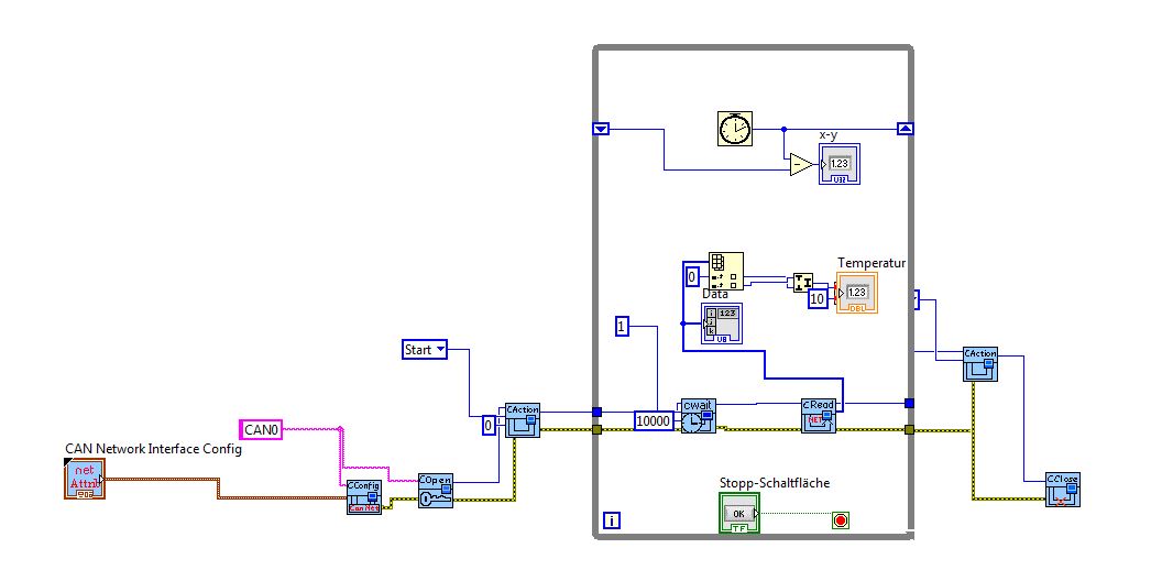 Was dagegen spricht die gesamte CAN Kommunikation in ein Programm zu packen…… meine zweimonatige Labview Erfahrung würde ich sagen .. :-) … ich stehe momentan wie der Ochs vorm Berg und weiß nicht wie ich anfangen soll.