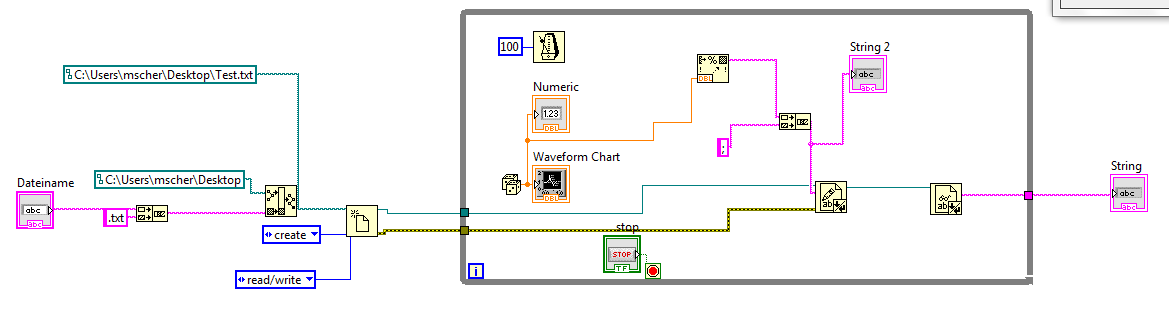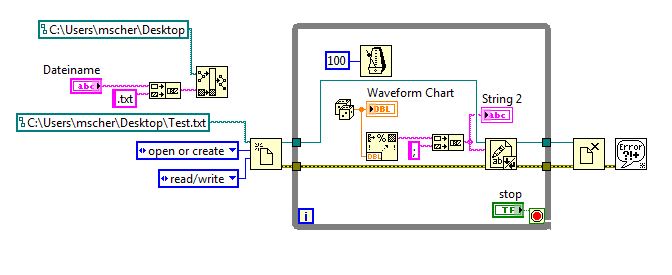 Außerdem halte ich es für keine gute Idee, in einer Schleife sowohl schreibend als auch lesend auf eine Datei zuzugreifen. Wozu soll das gut sein? Die Leseoperation ist eh Blödsinn: der gelesene String wird erst nach der Schleife angezeigt, also ist nur der letzte Lesezugriff relevant. Ergo: Leseoperation erst nach der Schleife durchführen. Außerdem: Schon mal über die Bedeutung der FilePosition (Advanced File functions) nachgedacht?