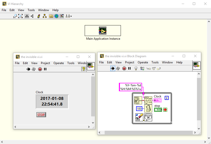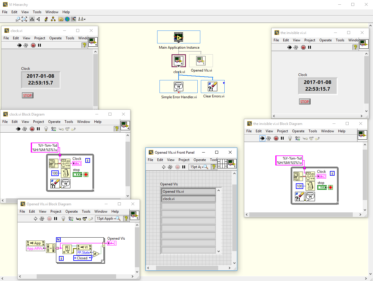 Hier ist ein Vergleich mit einer "normalen" VI. Die clock.vi hat denselben Code wie die invisible, wurde aber normal über FIle -> New VI erstellt (und nur der Code reinkopiert). Zusätzlich zeigt die "Opened VIs.vi" alle "VIs in memory" mit offenem front panel - sie listet nur sich selbst und die clock.vi, aber nicht die invisible. Ebenso zeigt das Hierarchie-Fenster nur die clock.vi mit den Subroutinen sowie die "Opened VIs.vi", aber nicht die invisible.