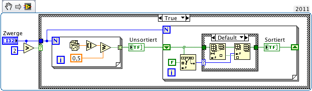 Um die Sache abzuschließen, hier die Lösung - natürlich als Labview - Lehrprogramm. (Dabei habe ich die Zusatzbedingung eingeführt, dass in der sortierten Reihe die Günen links und die Roten rechts stehen sollen. Es könnte auch anders herum oder zufällig sein)