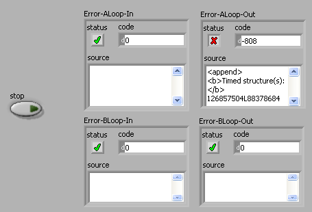 Ich habe bzgl. Timed Loops mit LabVIEW 2009 SP1, gerade ein sporadisch auftretendes Problem. Und zwar wird eine von zwei Loops nicht ausgeführt (Probe auf den Stop Button in erster Loop im Blockdiagram: Not executed). Wobei mir LabVIEW als Hinweis den Error-Code -808 zurückgibt. Auf den NI Seiten wird dieser Error soweit ich das gesehen habe nicht aufgeführt. Der eingebaute ErrorBrowser bietet mir allerdings den Hinweis, dass es sich um ein Problem bzgl. des Namens handeln soll. Nur sind die 2 Timed Loops, siehe Screenshot, klar mit A bzw. B bezeichnet worden.