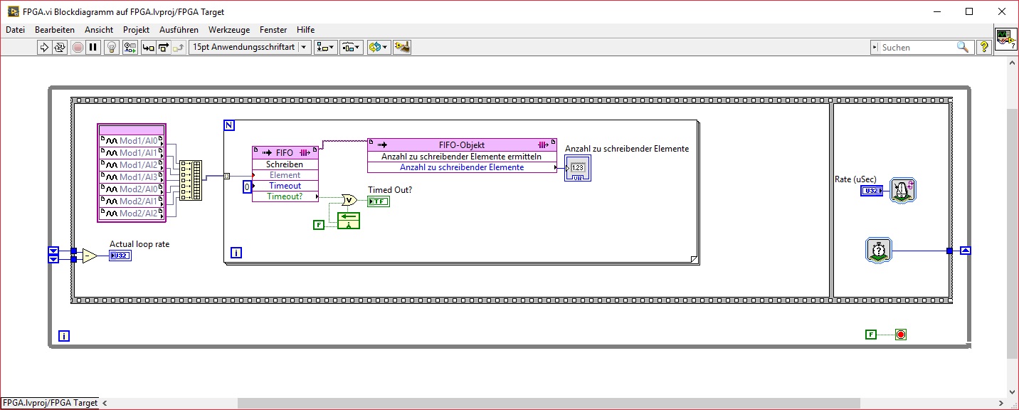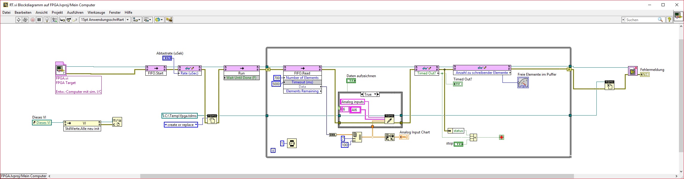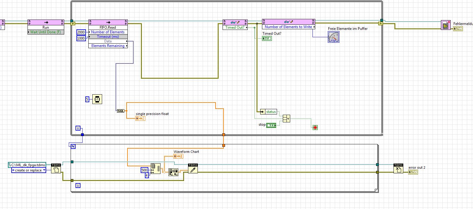 ich schreibe gerade meine Masterarbeit und muss dafür eine Hochgeschwindigkeits Messung in Labview programmieren. Das Ziel ist 7 Signale mit jeweils 100kHz abzutasten. Dafür habe ich ein cRIO 9082 und 2 Module mit jeweils 4 analogen Eingängen. Nun habe ich schon herausgefunden, dass ich dafür wohl sowohl FPGA als auch den cRIO programmieren muss und habe mir mit Hilfe dieses Tutorials eine Anwendung gebastelt. Solange ich mir die Messdaten nur anzeigen lasse, erreiche ich auch die 10usec (100kHz) Abtastzeit. Sobald ich allerdings beginne die Daten in eine TDMS Datei zu schreiben dauert es vielleicht eine halbe Sekunde und ich bekomme einen Timeout. Ich vermute es liegt daran, dass die TDMS Datei nicht schnell genug geschrieben und damit der FIFO nicht schnell genug geleert wird.