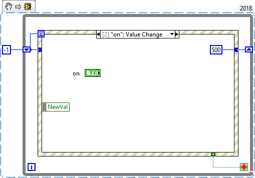 Musst du Code/ein VI alle x ms ausführen und diese wiederholte Ausführung starten und stoppen können? Dann wäre folgendes Beispiel, wie man das Timeout Event zum Timing nutzen kann, evtl. etwas für dich. Der ON-Button startet die wiederholte Ausführung des Timeout Cases, der Off-Button beendet diese wieder.