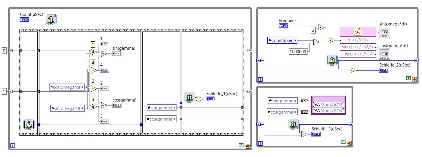 Des weitern habe ich in jeder While-Schleife mal einen Timer eingebaut um die zu überprüfen wie lange die Berechnungen in den jeweiligen Schleifen brauchen. Dabei ist rausgekommen, dass die erste Schleife weniger als eine µSekunde braucht, die 2. Schleife ca. 1 µSekunde und die 3. Schleife (die mit den Analogausgaben) ca. 5µSekunden.