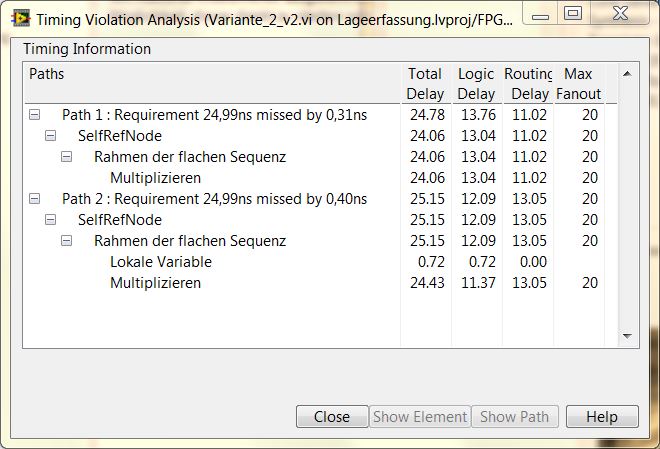 Deine Aussage mit dem Abarbeitungspfad gilt für Single Cylce Timed Loops (SCTL), die verwendest du ja gar nicht. Das kann es jetzt nicht sein. Was spukt denn die Info "Investigate Timing Violation" aus?