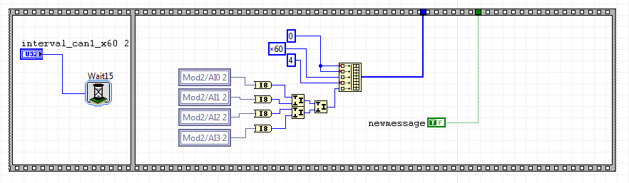 Für jede CAN-ID und den entsprechenden Port habe ich eine FPGA I/O Node erstellt. Das innere Wait gibt das Intervall vor, wobei das erste Intervall in der Gesamtsequenz eine Art Verzögerung vorgibt, damit die Nachrichten mit einem zeitlichen Versatz am Port herausgeschickt werden. Nicht schön, aber es funktioniert.