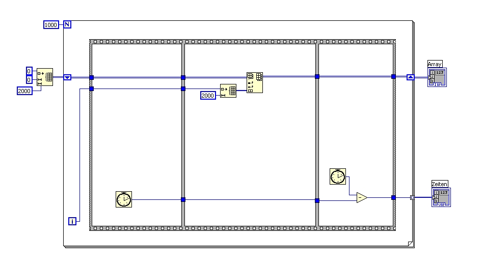 Ich bekomme meine Daten über ein USB-Interface. Diese Daten möchte ich in einem großen Array schreiben um dies anschließend visuell darzustellen. Jedoch nimmt die Verarbeitungszeit mit der Arraygröße deutlicht zu, so das ich nicht mehr schnell genug auf mein USB-Interface zugreifen kann. Dadurch kommt es zum Bufferüberlauf und somit gehen Daten verloren. Es kommt alle 5ms ein Datenblock von 2000 Bytes. Jedoch dauert das Schreiben der Daten schon ca. 15ms (so ca. beim 999 Block) Bei den ersten Blöcken braucht LabVIEW nur ca 1ms um die Daten in das Array zu speichern (siehe Arrays mit Zeiten).