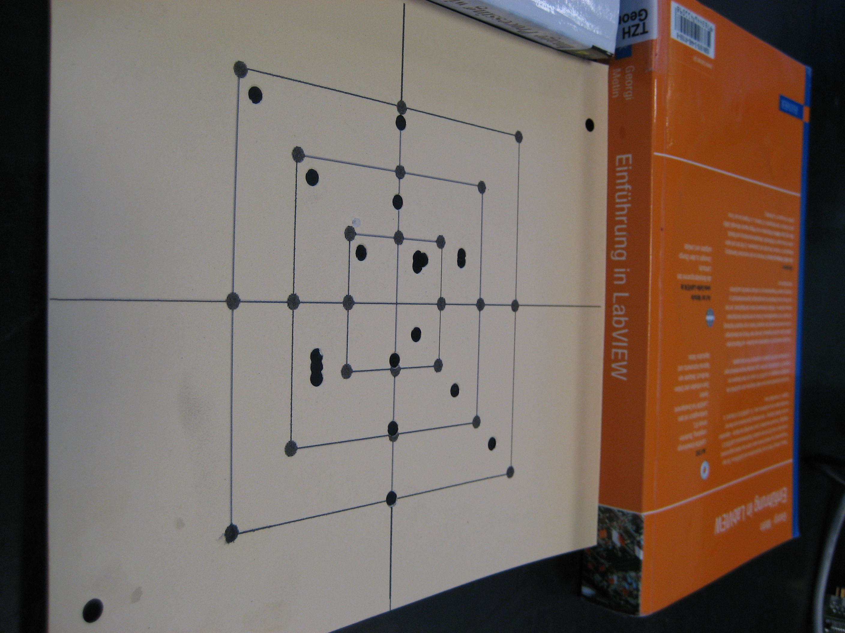 ich hab mir jetzt mal dein Bild genommen, es "gesäubert" und ich hoffe, dass das so in etwa hinkommt. Dann hab ich mir per Funktionsblock "Punkt setzen" quasi ein virtuelles Gewehr gebastelt. Ich kann also jetzt selber Löcher schießen, das macht es etwas handlicher und man kann schnell ein wenig testen. Morgen versuche ich mal die ersten Löcher zu finden. Problematisch werden speziell die Löcher die auf der weiß und schwarzen Schicht sind, aber naja mal sehen.