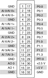 Jetzt brauchst du natürlich einen Eingang, an dem du das Signal, dessen Flanken du zählen willst (was anderes kann der Counter der 6009 nämlich nicht) anlegst. Diese legt man bei den neueren NI-Karten an den so bezeichneten PFI-Anschlüssen an. Da die 6009 nur einen programmierbaren PFI-Port hat (eben PFI0), musst du dort das Signal anschließen.