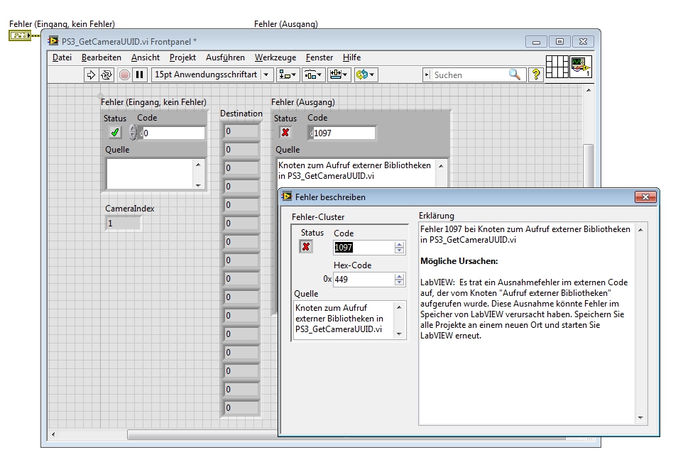 Nun will ich die nächste Fnktion ansprechen die mir die UUID der angeschlossenen Kamera ausgibt. Ich füttere die Funktion mit dem Kameraindex (hier 1) und setze den Dll-Knoten Rückgabewert auf "zeigergroßer integer". Jetzt kann ich diesen Pointer in eine zweite MoveBlock Dll-Knoten einbringen der mir dann die hinterlegten Daten (hier die UUID) in ein vorher initialisierten 128 bit Cluster schreibt. Den Bit-Cluster initialisiere ich mit 8 mal 8 bit Integer Werten (U8). Erwarten würde ich nun das am Ausgang meiner MoveBlock konstruktion die UUID in den Cluster geschrieben wird. Stattdessen erhalte ich Fehlermeldungen an meinem ersten DLL-Knoten. Also dem der die eigentliche Funktion implementiert. Wo ist hier mein Denkfehler? Ich komm partout nicht dahinter....