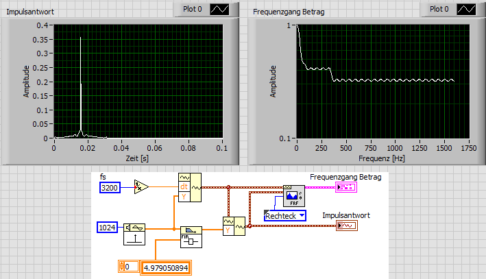 Für mein aktuelles LabVIEW-Projekt benötige ich einen FIR-Filter, der ein Eingangssignal mit Frequenzen bis zu f=1600 Hz (Daraus folgt f_sample=3200 Hz) filtert. Das Programm nimmt Messwerte mit einer Samplefrequenz von 3200 Hz auf und wertet diese sekundenweise kontinuierlich aus. Über den Parks&McClellan-Algorithmus habe ich die benötigten Filterkoeffizienten h bestimmt. Ich möchte nun überprüfen, ob mein Filter wirklich tut was, er soll, bevor ich ihn verwende.