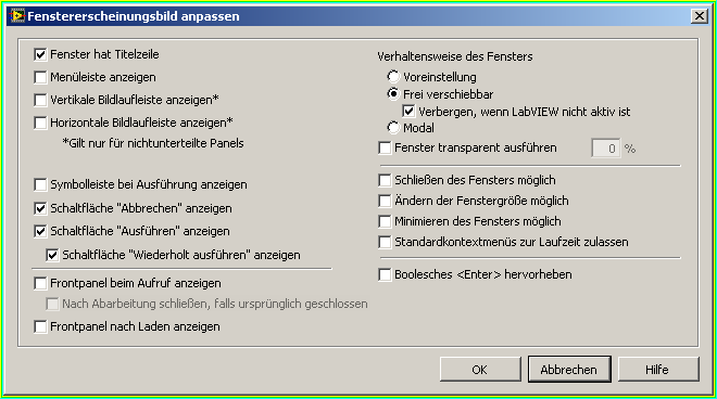 Ich habe mal ein SubVI mit nur einem Graph erstellt und die besagten Eigenschaften im Fenstererscheinungsbild gesetzt. Mit dem VI aus Deinem letzten Post wird das VI auch geöffnet, aber es sieht aus wie jedes andere VI auch! Mit Fenstertitel, Menüzeile, usw. Muss ich da eventuell noch mehr Einstellungen vornehmen?