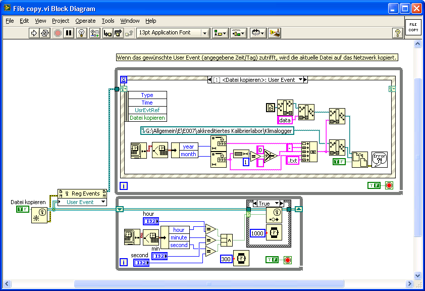 Wenn die Event-Struktur also einmal abgearbeitet wurde, so muss sie solange warten, bis auch die parallele While-Schleife abgearbeitet worden ist. Erst dann kann die Event-Struktur erneut starten. Da die papallele While-Schleife aber nie endet, wird die Event-Struktur kein zweites Mal gestartet.