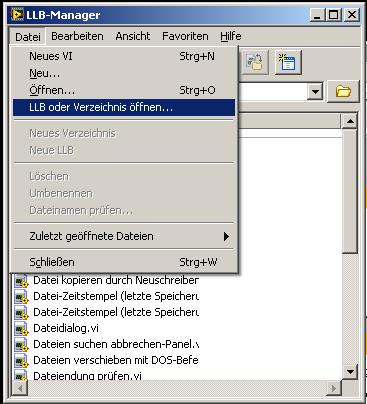 Werkzeuge ... LLB-Manager ... Datei ... Öffnen ... <.llb> auswählen ... Öffnen ...