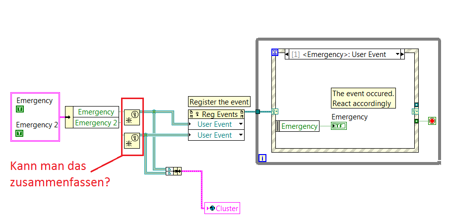 Du missverstehst mich. Das mit den Ereignissen funktioniert schon, es ist im Block Diagramm nur etwas unübersichtlich. Und ich wüsste gerne, wie ich das in Verbindung mit Clustern besser zusammenpacke.